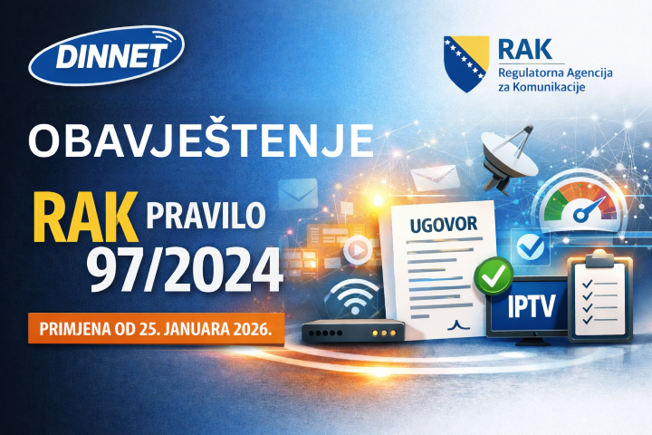 Ovim putem Vas obavještavamo da je operater DINNET d.o.o. Gračanica izvršio usklađivanje Opštih uslova poslovanja i Cjenovnika usluga sa navedenim Pravilom 97/2024.